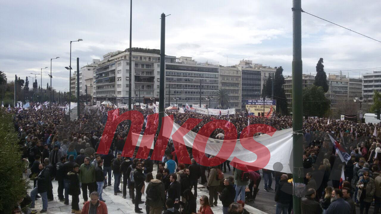 H μαζική πορεία του ΠΑΜΕ έφτασε στο Σύνταγμα, όπου πραγματοποιείται διαδήλωση διαμαρτυρίας από τους αγρότες.