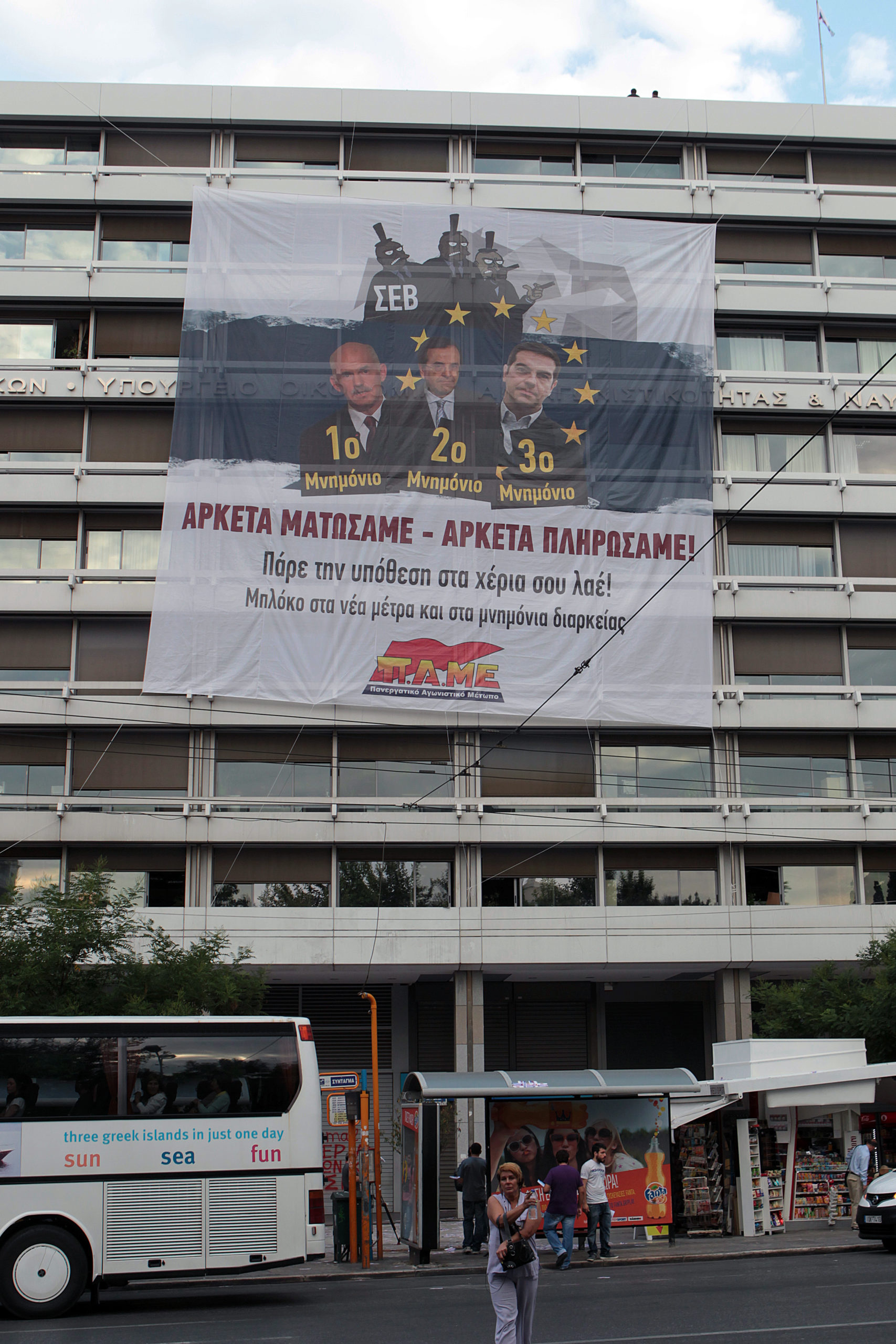 «Αυτή τη στιγμή, εργαζόμενοι από δεκάδες σωματεία του Ιδιωτικού και του Δημόσιου τομέα που συσπειρώνονται στο ΠΑΜΕ, πραγματοποιούν κινητοποίηση στο Υπουργείο Οικονομικών έχοντας απλώσει ένα τεράστιο πανό στην πρόσοψη του κτιρίου με σύνθημα: «Αρκετά ματώσαμε, αρκετά πληρώσαμε! Πάρε την υπόθεση στα χέρια σου λαέ! Μπλόκο στα νέα μέτρα και στα μνημόνια διαρκείας.»