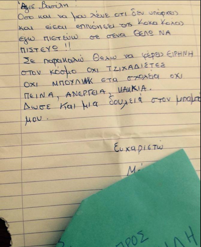Το παιδί στο γράμμα του δεν ζήτα παιχνίδια και ρούχα αλλα “ειρήνη στον κόσμο” και “δουλειά στον μπαμπά.”