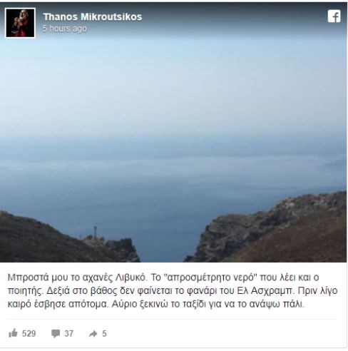 Μάλιστα, πριν λίγες ώρες, ο ίδιος δημοσίευσε στην προσωπική του σελίδα στο Facebook μια φωτογραφία από το μέρος όπου βρίσκεται σχολιάζοντας στη λεζάντα που την συνόδευε: «Μπροστά μου το αχανές Λιβυκό. Το “απροσμέτρητο νερό” που λέει και ο ποιητής. Δεξιά στο βάθος δεν φαίνεται το φανάρι του Ελ Ασχραμπ. Πριν λίγο καιρό έσβησε απότομα. Αύριο ξεκινώ το ταξίδι για να το ανάψω πάλι».