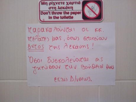 Η ιδιοκτήτρια ενός μεζεδοπωλείου στην Πάτρα απελπίστηκε με την κατάσταση που επικρατούσε στην ανδρικές τουαλέτες και αποφάσισε να… παρέμβει με χιουμοριστικό τρόπο. Συγκεκριμένα η ιδιοκτήτρια κόλλησε ένα χαρτί με ένα πρωτότυπο μήνυμα στις ανδρικές τουαλέτες του μαγαζιού, παρακαλώντας τους πελάτες να είναι πιο προσεκτικοί. Παράλληλα παροτρύνει όσους πελάτες δυσκολεύονται να ζητήσουν τη βοήθεια της… Διευθύνσεως. Έτσι όποιος άνδρας πελάτης επισκέπτεται τις τουαλέτες του μαγαζιού της, βλέπει πλέον αυτό το μήνυμα, το οποίο έχει γίνει viral.