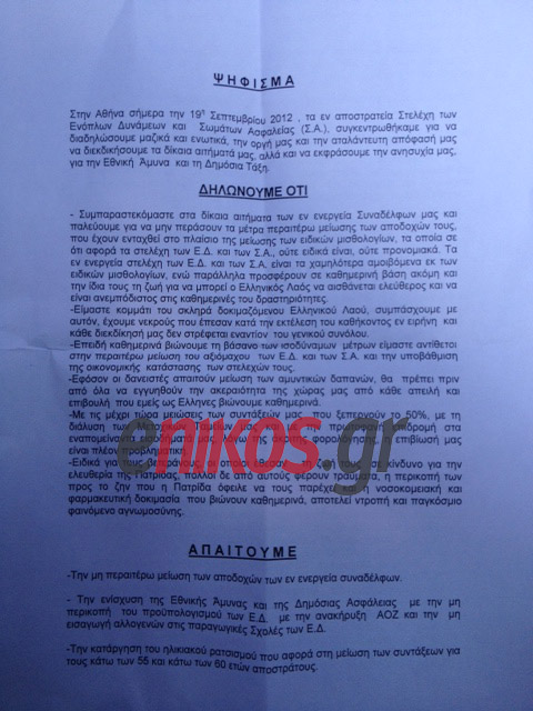 Διαβάστε το ψήφισμα διαμαρτυρίας που αναμένεται να αποδώσουν στον υπουργό Οικονομικών Γιάννη Στουρνάρα οι απόστρατοι Αξιωματικοί.Οι ένστολοι πραγμαοποιούν αυτή την ώρα συγκέντρωση διαμαρτυρίας στην πλατεία Κλαυθμώνος αντιδρώντας στο «ψαλίδι» που μπαίνει στα έσοδά τους.
