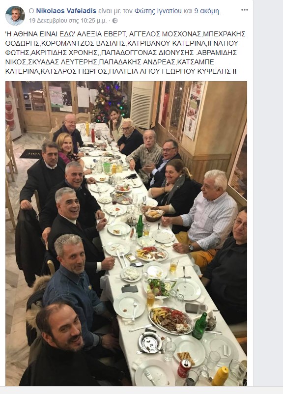 Δεν είναι μόνο οι παλιοί συμμαθητές που διοργανώνουν «reunion» για να θυμηθούν τα παλιά και να πουν τα νέα τους. Την μόδα ακολουθούν και τα μέλη της ηγετικής ομάδας του Δήμου Αθηναίων, επί δημαρχίας Νικήτα Κακλαμάνη. Πρώην αντιδήμαρχοι και δημοτικοί σύμβουλοι, διατηρούν ακόμη και σήμερα άριστες σχέσεις και συχνά πυκνά βρίσκουν ευκαιρία να συναντηθούν.Όπως έγινε και το βράδυ της Τρίτης, όταν πήγαν για φαγητό στην πλατεία Αγίου Γεωργίου Κυψέλης, δηλώνοντας «Η Αθήνα είναι εδώ»… Πρόκειται για το όνομα της κίνησης που δημιούργησαν, με σκοπό να δηλώσουν παρόντες στα δημοτικά δρώμενα. Στο δείπνο παραβρέθηκαν ο Νίκος Βαφειάδης (ο οποίος εξακολουθεί να είναι δημοτικός σύμβουλος με την παράταξη του κ. Κακλαμάνη και γραμματέας του δημοτικού συμβουλίου), η Αλεξία Έβερτ, ο Άγγελος Μοσχονάς, ο Θοδωρής Μπεχράκης, ο Βασίλης Κορομάντζος, η Κατερίνα Κατριβάνου, ο Φώτης Ιγνατίου, ο Χρόνης Ακριτίδης, ο Διονύσης Παπαδόγγονας, ο Νίκος Αβραμίδης (είναι και νυν δημοτικός σύμβουλος με την Παναθηναϊκή Συμμαχία), ο Λευτέρης Σκιαδάς, ο Ανδρέας Παπαδάκης, η Κατερίνα Κατσαμπέ και ο Γιώργος Κατσαρός.
