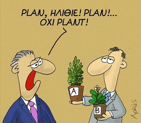 Στο σκίτσο που ανέβασε σήμερα στον επίσημο λογαριασμό του στο Facebook, o ένας πρωταγωνιστής κρατάει δυο φυτά στα χέρια του, όπου στο ένα αναγράφεται “Α” και στο άλλο “Β”. Tα δείχνει στον δεύτερο πρωταγωνιστή, θεωρώντας πως έφερε ό,τι του ζήτησε. Δηλαδή δυο φυτά (plants). Ο άλλος, τον βλέπει και του λέει θυμωμένος: ” Plan, ηλίθιε! Plan! Όχι plant!”.