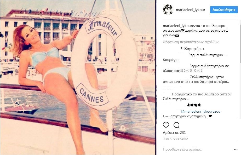 Θλίψη έχει προκαλέσει ο αιφνίδιος θάνατος της ηθοποιού Ζωής Λάσκαρη, η οποία έφυγε χθες από τη ζωή, σε ηλικία 73 ετών.Η κόρη της αγαπημένης ηθοποιού Μαρία-Ελένη Λυκουρέζου, με μία συγκινητική ανάρτηση στον προσωπικό της λογαριασμό στο Instagram, και με ελάχιστα αλλά ουσιώδη λόγια, αποχαιρετά τη μητέρα της.«Το πιο λαμπρό αστέρι μου.. μαμάκα μου σε ευχαριστώ για όλα», ήταν η λεζάντα που συνόδευε την ανάρτησή της.Δείτε την ανάρτηση: