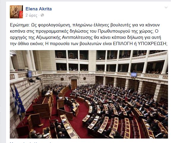 «Ερώτημα: Ως φορολογούμενη, πληρώνω έλληνες βουλευτές για να κάνουν κοπάνα στις προγραμματικές δηλώσεις του Πρωθυπουργού της χώρας; Ο αρχηγός της Αξιωματικής Αντιπολίτευσης θα κάνει κάποια δήλωση για αυτή την άθλια εικόνα; Η παρουσία των βουλευτών είναι ΕΠΙΛΟΓΗ ή ΥΠΟΧΡΕΩΣΗ;».