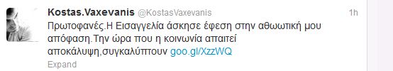 «Πρωτοφανές. Η Εισαγγελία άσκησε έφεση στην αθωωτική μου απόφαση. Την ώρα που η κοινωνία απαιτεί αποκάλυψη, συγκαλύπτουν», ήταν το σχόλιο του κ. Βαξεβάνη στο twitter.