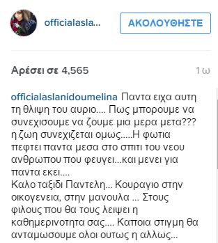 Με ένα συγκινητικό κείμενο στον προσωπικό της λογαριασμό στο Instagram η Μελίνα Ασλανίδου είπε το δικό της «αντίο» στον Παντελή Παντελίδη.