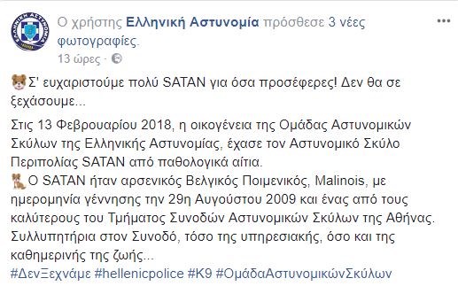 Με μία συγκινητική ανάρτηση στο Facebook, η Ελληνική Αστυνομία αποχαιρέτησε τον SATAN, τον αστυνομικό σκύλο περιπολίας που προσέφερε σημαντική βοήθεια στο έργο της ΕΛΑΣ και έφυγε από τη ζωή την Τρίτη, προκαλώντας βαθιά θλίψη στον συνοδό του, αλλά και σε όλη την αστυνομία.«Σ’ ευχαριστούμε πολύ SATAN για όσα προσέφερες! Δεν θα σε ξεχάσουμε…», σημειώνεται στην ανάρτηση και προστίθεται: «Στις 13 Φεβρουαρίου 2018, η οικογένεια της Ομάδας Αστυνομικών Σκύλων της Ελληνικής Αστυνομίας, έχασε τον Αστυνομικό Σκύλο Περιπολίας SATAN από παθολογικά αίτια.O SATAN ήταν αρσενικός Βελγικός Ποιμενικός, Malinois, με ημερομηνία γέννησης την 29η Αυγούστου 2009 και ένας από τους καλύτερους του Τμήματος Συνοδών Αστυνομικών Σκύλων της Αθήνας.Συλλυπητήρια στον Συνοδό, τόσο της υπηρεσιακής, όσο και της καθημερινής της ζωής…».
