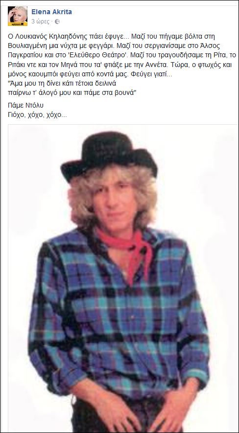 Η Έλενα Ακρίτα αποχαιρέτησε τον Λουκιανό Κηλαηδόνη με μια συγκινητική της ανάρτηση στο Facebook. Η δημοσιογράφος ανέβασε μια φωτογραφία με τον σπουδαίο τραγουδοποιό ντυμένο καουμπόι παραπέμποντας στη γνωστή επιτυχία του και χρησιμοποίησε στίχους του για να του πει αντίο.