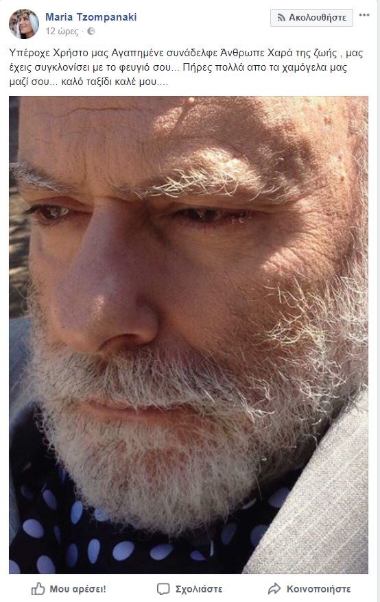 Ο ηθοποιός, ήταν ιδιαίτερα αγαπητός στο κοινό αλλά και στους συναδέλφους του. Μια από αυτούς, η Μαρία Τζομπανάκη θέλησε να τον αποχαιρετήσει μέσα από μια συγκινητική ανάρτηση στο Facebook.