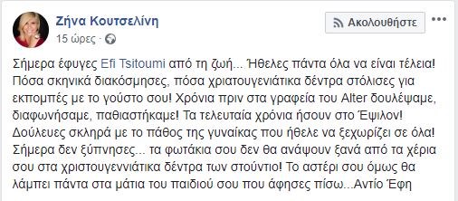Με ένα συγκινητικό μήνυμα αποχαιρέτησε την Έφη Τσιτούμη, η οποία έφυγε ξαφνικά από τη ζωή, η Ζήνα Κουτσελίνη.