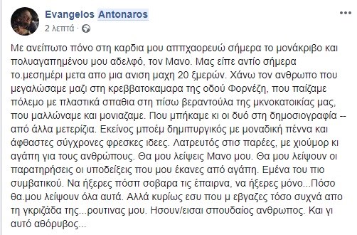 Στη συγκινητική του ανάρτηση ο κ. Αντώναρος τονίζει μεταξύ άλλων: “Με ανείπωτο πόνο στην καρδιά μου αποχαιρετώ σήμερα το μονάκριβο και πολυαγαπημένο μου αδελφό, τον Μάνο. Χάνω τον άνθρωπο που παίζαμε πόλεμο με πλαστικά σπαθιά στη πίσω βεραντούλα της μονοκατοικίας μας, που μαλώναμε και μονιάζαμε”.