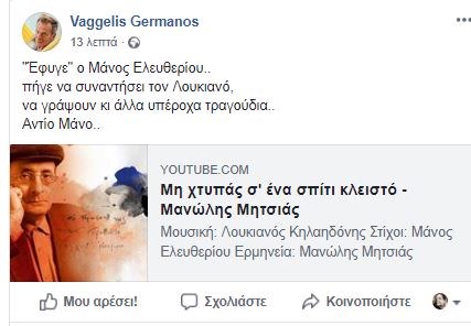 Με ένα συγκινητικό μήνυμα στο facebook, ο Βαγγέλης Γερμανός αποχαιρετά τον Μάνο Ελευθερίου, ο οποίος απεβίωσε τα ξημερώματα.