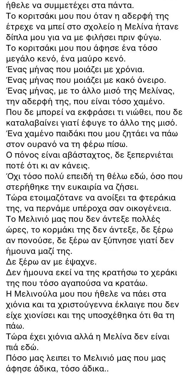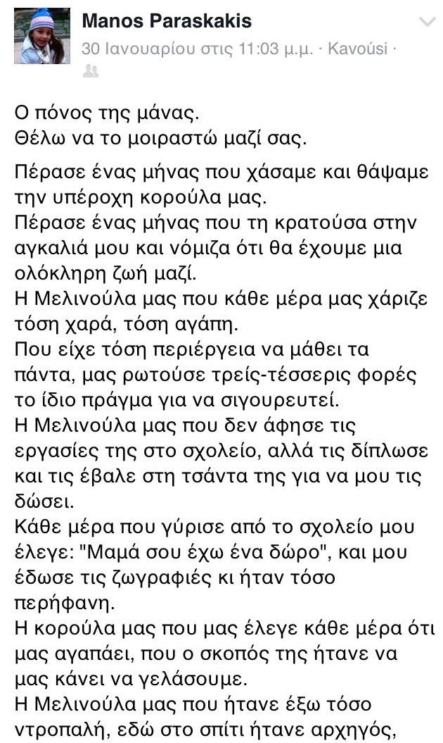 Ένα συγκινητικό μήνυμα έγραψε στη σελίδα του συζύγου της στο Facebook η μητέρα της 4χρονης Μελίνας Παρασκάκη που πριν ένα μήνα είδε το αγγελούδι της να σβήνει στο νοσοκομείο μετά από μία επέμβαση ρουτίνας.