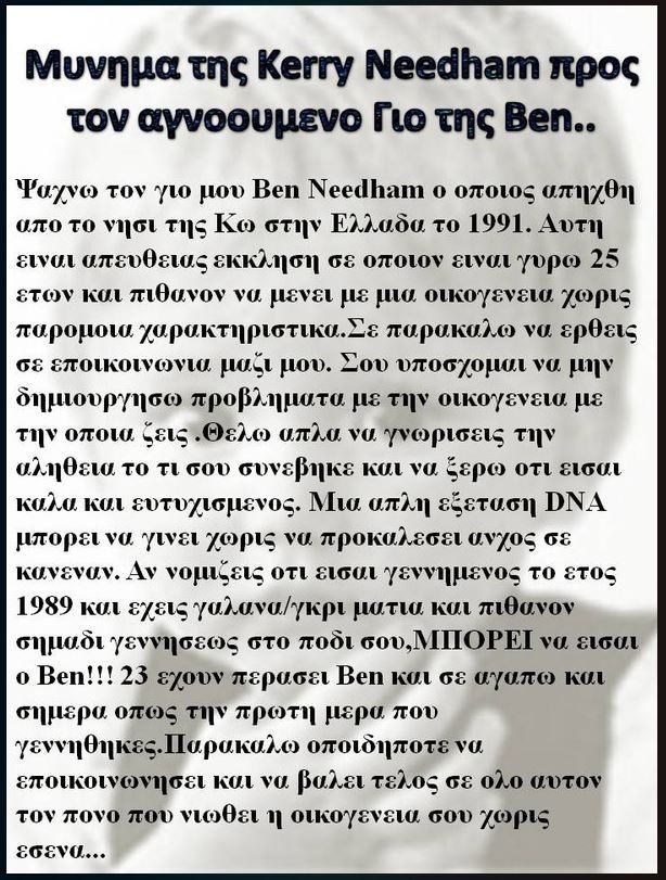 Σε αυτόν απευθύνεται και η έκκληση – μήνυμα, το οποίο ανάρτησε μόλις χθες στην ειδική σελίδα που έχει δημιουργηθεί, προκειμένου να βρεθεί ο 25χρονος σήμερα Ben.