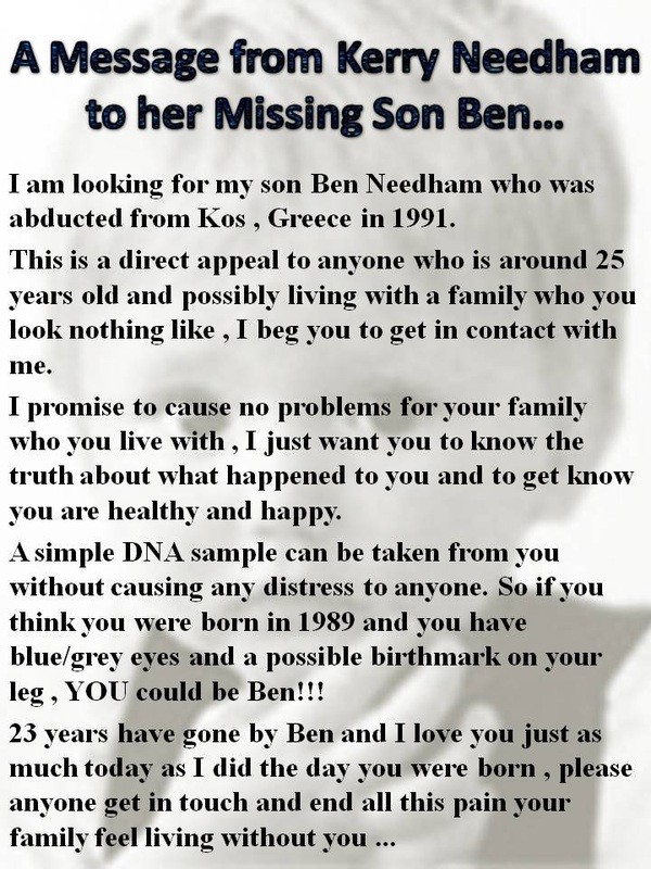 Όλα αυτά τα χρόνια, η μητέρα του, έχοντας τη βεβαιότητα πως το παιδί της έπεσε θύμα απαγωγής, ελπίζει πως κάποια στιγμή θα εμφανιστεί ένας – νέος πλέον – άνθρωπος, ο οποίος θα αποδειχθεί πως είναι ο Μπεν.