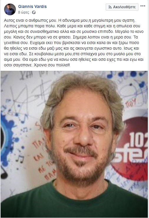 «Αυτός είναι ο άνθρωπος μου. Η αδυναμία μου, η μεγαλύτερη μου αγάπη. Λείπεις μπαμπά πάρα πολύ. Κάθε μέρα και κάθε στιγμή και η απώλεια σου μεγάλη και σε συναισθηματικό αλλά και σε μουσικό επίπεδο. Μεγάλο το κενό σου. Κανείς δεν μπορεί να σε φτάσει. Σήμερα λοιπόν είναι η μέρα σου. Τα γενέθλια σου. Εύχομαι εκεί που βρίσκεσαι να είσαι καλά αν και ξέρω πόσο θα ήθελες να είσαι εδώ μαζί μας και ας ακούγεται εγωιστικό αυτό. Ίσως και να είσαι εδώ. Σε κουβαλάω μέσα μου, στα σπλάχνα μου στο μυαλό μου στο αίμα μου. Θα είμαι εδώ για να κάνω όσα ήθελες και όσα είχες πει και εγώ και όσοι σ’ αγαπάνε. Χρονιά σου πολλά!!», έγραψε χαρακτηριστικά ο Γιάννης Βαρδής.
