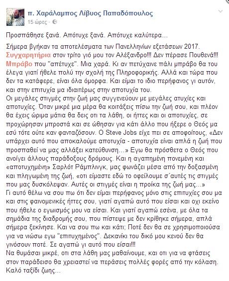 Συγκεκριμένα, ο 18χρονος δεν πέρασε πουθενά και δεν πέτυχε στο διαγωνισμό των πανελληνίων. Ωστόσο, ο ίδιος πατέρας δεν δυσαρεστήθηκε με το αποτέλεσμα, αλλά αντιθέτως εξέφρασε την περηφάνια του για «τις επιτυχίες του γιου και τις φαινομενικές του ήττες».