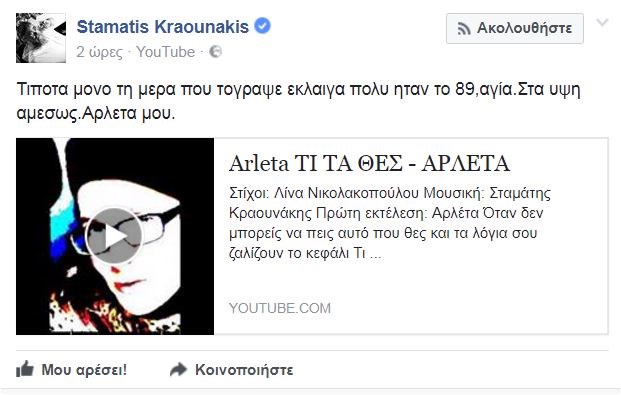 Στη θλίψη έχει βυθιστεί ο καλλιτεχνικός κόσμος μετά την είδηση του θανάτου της σπουδαίας ερμηνεύτριας και τραγουδοποιού Αρλέτας.Ο μουσικοσυνθέτης Σταμάτης Κραουνάκης, αποχαιρέτησε την Αρλέτα με μία ανάρτηση στον προσωπικό του λογαριασμό στο facebook.Συγκεκριμένα, ανέβασε το τραγούδι «Τι τα θες», που έχει συνθέσει ο ίδιος σε στίχους της Λίνας Νικολακοπούλου και ερμήνευε η Αρλέτα, γράφοντας χαρακτηριστικά: «Τίποτα μόνο τη μέρα που το ‘γραψε έκλαιγα πολύ ήταν το 89. Αγία. Στα ύψη αμέσως Αρλέτα μου».