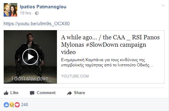 Ο Υπάτιος Πατμάνογλου, που έχασε στο τραγικό τροχαίο της Εθνικής Οδού Αθηνών – Λαμίας την γυναίκα και το παιδί του, ανέβασε στον προσωπικό του λογαριασμό στο Facebook, ένα βίντεο το οποίο ενημερώνει για τους κινδύνους της υπερβολικής ταχύτητας.