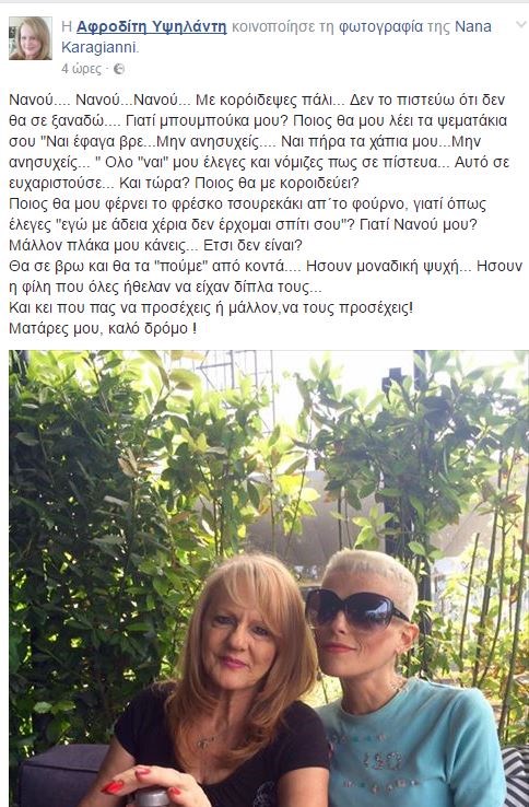 Συγκλόνισε στο αντίο της στη Νανά Καραγιάννη η φίλη της, Αφροδίτη Υψηλάντη.