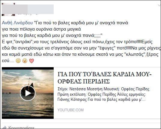 Από την στιγμή που βρέθηκε η σορός της 37χρονης σε χωράφι του συζυγοκτόνου, ο τοίχος της στο Facebook έχει γεμίσει από δεκάδες συγκινητικά μηνύματα ανθρώπων που τη γνώριζαν. Ένα που ξεχωρίζει είναι αυτό μιας φίλης της, η οποία ανέβασε το τραγούδι «Για πού το ‘βαλες καρδιά μου» του Ορφέα Περίδη με το ακόλουθο σχόλιο: