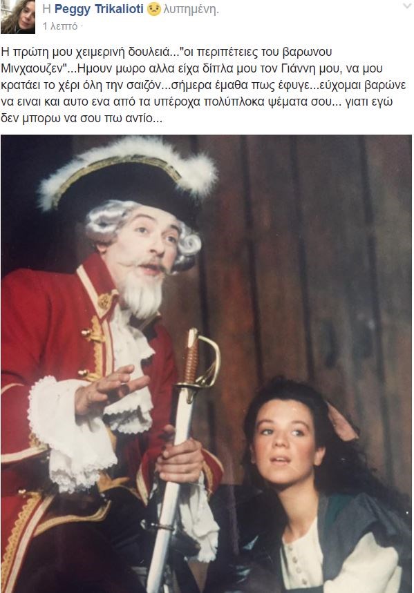 “Η πρώτη μου χειμερινή δουλειά…”οι περιπέτειες του βαρώνου Μινχαουζεν”…Ήμουν μωρό αλλά είχα δίπλα μου τον Γιάννη μου, να μου κρατάει το χέρι όλη την σαιζόν…σήμερα έμαθα πως έφυγε…εύχομαι βαρώνε να είναι και αυτό ένα από τα υπέροχα πολύπλοκα ψέματα σου… γιατί εγώ δεν μπορώ να σου πω αντίο…”.