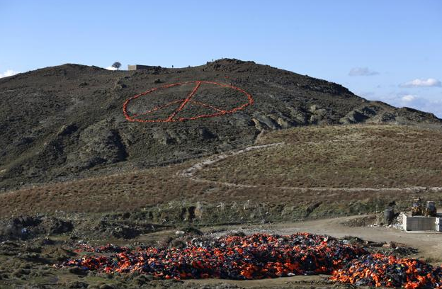 Συγκεντρώνοντας πάνω από 2.500 σωσίβια, που εγκαταλείπουν στις ακτές οι πρόσφυγες που φτάνουν καθημερινά στο νησί, έφτιαξαν το σήμα της ειρήνης.