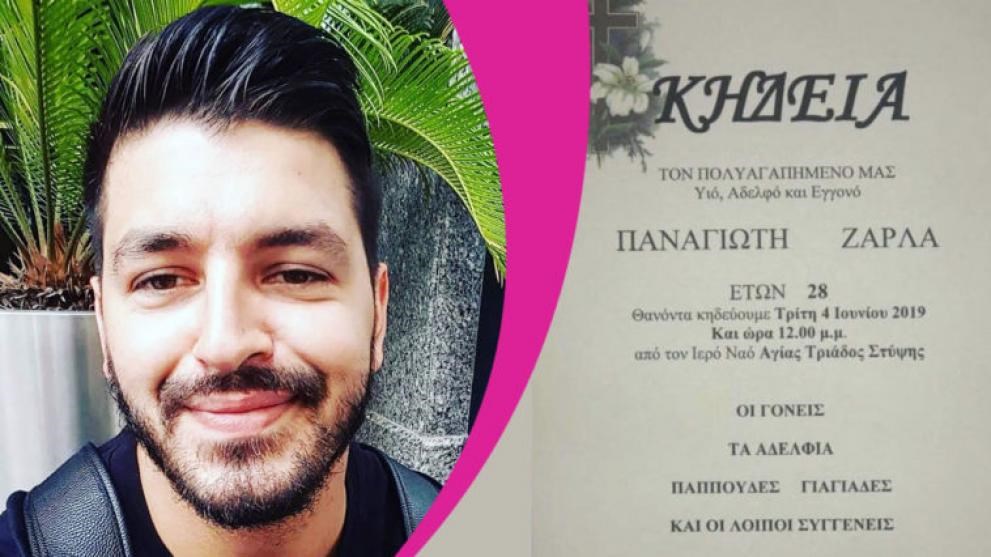 Η μητέρα του, Στέλλα Νικολάου, με ανάρτησή της στο Facebook αποκάλυψε την τελευταία επιθυμία του 28χρονου: “Ο Πάνος Ζάρλας λάτρευε τα παιδιά! Επιθυμία του λοιπόν και της οικογένειάς του αντί στεφάνων στη μνήμη του τα χρήματα να συγκεντρωθούν για τη βοήθεια του μικρού κοριτσιού που πρόκειται να χειρουργηθεί”.
