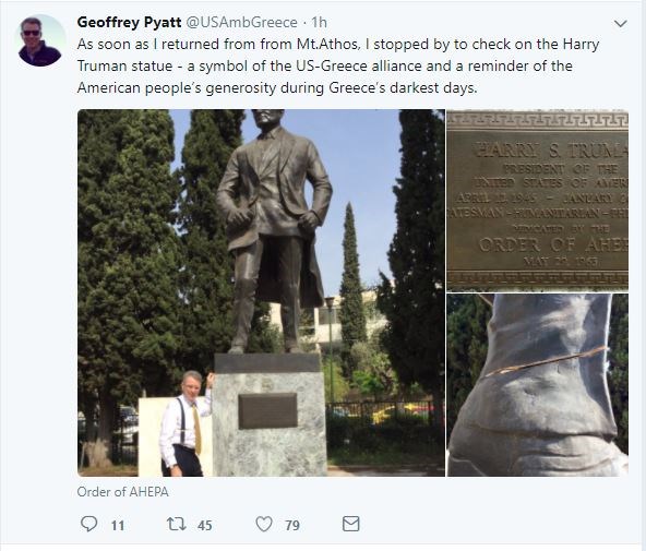 Το άγαλμα του πρώην προέδρου των ΗΠΑ, Χάρι Τρούμαν, επισκέφθηκε ο Αμερικανός πρέσβης Τζέφρι Πάιατ.