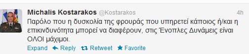 Τη στιγμή που βρίσκεται σε εξέλιξη η πορεία των ένστολων στο κέντρο της Αθήνας για το «ψαλίδι» στους μισθούς, ο αρχηγός ΓΕΕΘΑ στέλνει το δικό του μήνυμα. «Παρόλο που η δυσκολία της φρουράς που υπηρετεί κάποιος ή/και η επικινδυνότητα μπορεί να διαφέρουν, στις Ένοπλες Δυνάμεις είναι ΟΛΟΙ μάχιμοι.»,σχολιάζει ο Μιχάλης Κοσταράκος, αρχηγός του Γενικού Επιτελείου Εθνικής Άμυνας στον προσωπικό λογαριασμό στο Twitter.