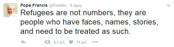 «Οι πρόσφυγες δεν είναι αριθμοί, είναι άνθρωποι που έχουν πρόσωπα, ιστορίες και είναι ανάγκη να αντιμετωπιστούν ως τέτοιοι», ανέφερε μέσω του επίσημου λογαριασμού του στο Twitter, ο προκαθήμενος της Ρωμαιοκαθολικής Εκκλησίας, Πάπας Φραγκίσκος, στο πλαίσιο της επίσημης επίσκεψης που πραγματοποιεί μαζί με τον Οικουμενικό Πατριάρχη Βαρθολομαίο, τον Αρχιεπίσκοπο Αθηνών και Πάσης Ελλάδος Ιερώνυμο και τον πρωθυπουργό Αλέξη Τσίπρα στη Λέσβο, στην προσπάθεια τους για την ευαισθητοποίηση της παγκόσμιας κοινής γνώμης στο προσφυγικό-μεταναστευτικό.