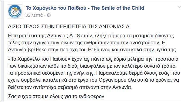 «Η περιπέτεια της Αντωνίας Α., 8 ετών, έληξε σήμερα το μεσημέρι δίνοντας τέλος στην αγωνία των δικών της ανθρώπων που την αναζητούσαν», υπογραμμίζει σε ανακοίνωσή του το Χαμόγελο του Παιδιού και προσθέτει: «Η Αντωνία βρέθηκε στην περιοχή του Ρεθύμνου και είναι καλά στην υγεία της.