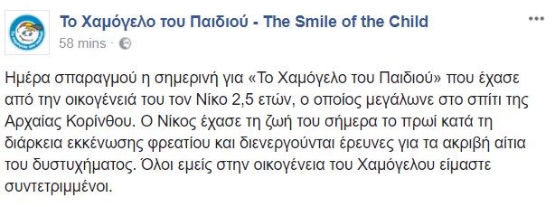 “Ημέρα σπαραγμού η σημερινή για «Το Χαμόγελο του Παιδιού» που έχασε από την οικογένειά του τον Νίκο 2,5 ετών, ο οποίος μεγάλωνε στο σπίτι της Αρχαίας Κορίνθου” επισημαίνει σε ανάρτησή του στο Facebook το “Χαμόγελο του Παιδιού” και προσθέτει: