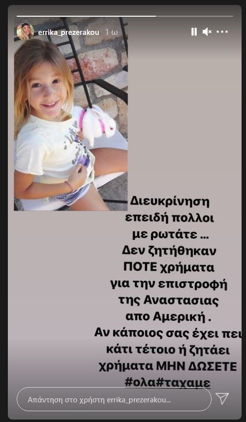 Σήμερα, επανέρχεται με νέο insta story στο οποίο αναφέρεται στο γεγονός ότι κάποιοι ζητούν χρήματα προκειμένου να επιστρέψει η σορός της Αναστασίας από τις ΗΠΑ. Όπως έγραψε συγκεκριμένα η πρωταθλήτρια στο άλμα επί κοντώ: «Διευκρίνιση επειδή πολλοί με ρωτάτε… Δεν ζητήθηκαν ΠΟΤΕ χρήματα για την επιστροφής της Αναστασίας από την Αμερική. Αν κάποιος σας έχει πει κάτι τέτοιο ή ζητάει χρήματα ΜΗΝ ΔΩΣΕΤΕ. #ολα #ταχαμε” σημείωσε η Έρρικα Πρεζεράκου.