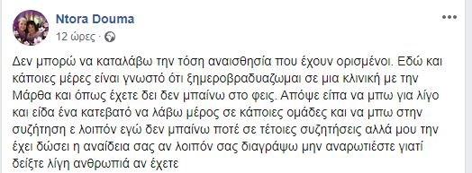 Όπως έγραψε: “Δεν μπορώ να καταλάβω την τόση αναισθησία που έχουν ορισμένοι. Εδώ και κάποιες μέρες είναι γνωστό ότι ξημεροβραδιάζομαι σε μια κλινική με την Μάρθα και όπως έχετε δει δεν μπαίνω στο φέις. Απόψε είπα να μπω για λίγο και είδα ένα κατεβατό να λάβω μέρος σε κάποιες ομάδες και να μπω στην συζήτηση ε λοιπόν εγώ δεν μπαίνω ποτέ σε τέτοιες συζητήσεις αλλά μου την έχει δώσει η αναίδεια σας αν λοιπόν σας διαγράψω μην αναρωτιέστε γιατί δείξτε λίγη ανθρωπιά αν έχετε”.