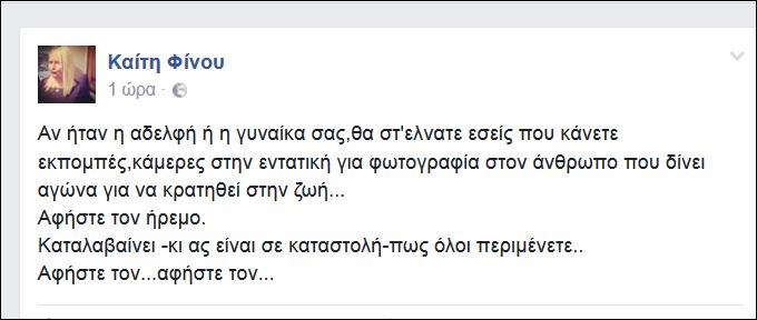 Με ανάρτησή της στον προσωπικό της λογαριασμό στο Facebook, η Καίτη Φίνου ξέσπασε κατά των ΜΜΕ για τον τρόπο που αντιμετωπίζουν την υπόθεση της υγείας του Στάθη Ψάλτη.Συγκεκριμένα έγραψε:«Αν ήταν η αδελφή ή η γυναίκα σας, θα στέλνατε εσείς που κάνετε εκπομπές, κάμερες στην εντατική για φωτογραφία στον άνθρωπο που δίνει αγώνα για να κρατηθεί στην ζωή…Αφήστε τον ήρεμο.Καταλαβαίνει -κι ας είναι σε καταστολή-πως όλοι περιμένετε…Αφήστε τον… αφήστε τον…».