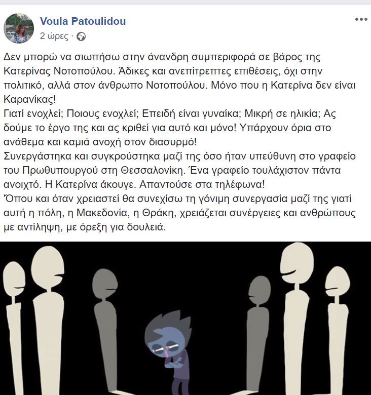 Με ανάρτησή της στον προσωπικό της λογαριασμό στο Facebook η Αντιπεριφερειάρχης Μητροπολιτικής Ενότητας Θεσσαλονίκης, Βούλα Πατουλίδου, εξέφρασε την οργή της για τις επιθέσεις που δέχεται η νέα υφυπουργός Μακεδονίας και Θράκης, Κατερίνα Νοτοπούλου.