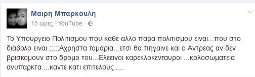 «Το Υπουργείο Πολιτισμού που κάθε άλλο παρά πολιτισμού είναι…πού στο διάβολο είναι ;;;;;Άχρηστα τομάρια…έτσι θα πήγαινε και ο Αντρέας αν δεν βρισκόμουν στο δρόμο του…Ελεεινοί καρεκλοκένταυροι …κολοσωματεία ανύπαρκτα …κάντε κάτι επιτέλους…..».