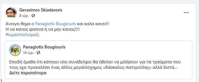 Ο Γεράσιμος Σκιαδαρέσης όμως στήριξε και τον Παναγιώτη Μπουγιούρη που με ανάρτησή του στα social media ξέσπασε κατά του σκηνοθέτη Στάθη ΛΙβαθινού για τον οποίο έγραχε μεταξύ άλλων: “Ήσασταν χυδαίος , προσβλητικός, ακρωτηριαστικός, ευνουχιστικός, ταπεινωτικός και απόλυτα χειριστικός!” Ο Γεράσιμος Σκιαδαρέσης έγραψε με τη σειρά του. “Ανοίγει θέμα ο Παναγιώτης Μπουγιούρης και καλά κάνει!!! Ή να κάνεις φασίνα ή να μην κάνεις!!!” αναφερόμενος στην ανάγκη να καθαρίσει ο χώρος.