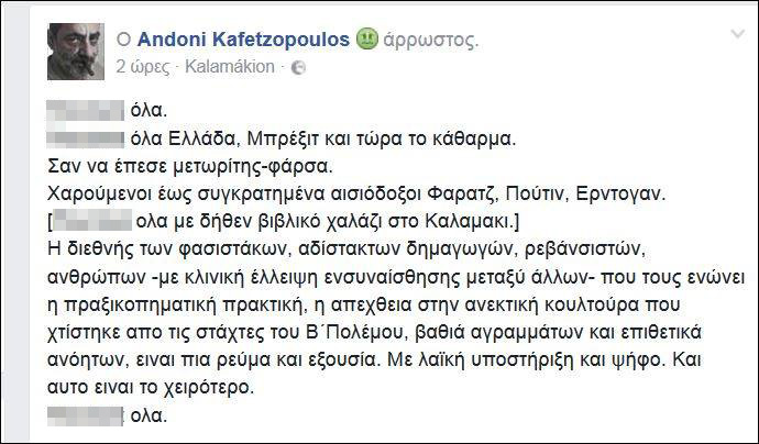 Ο Αντώνης Καφετζόπουλος ξέσπασε με ανάρτησή του στο Facebook για την εκλογή του Ντόναλντ Τραμπ στην προεδρία των ΗΠΑ.
