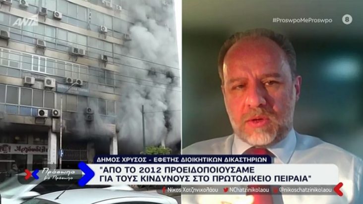 Το “καμπανάκι” έκρουσε ο πρόεδρος στο Διοικητικό Πρωτοδικείο Πειραιά, Δήμος Χρυσός, μιλώντας στην εκπομπή «Πρόσωπο με Πρόσωπο» για την πυρκαγιά που ξέσπασε στο κτίριο και τις συνθήκες εργασίας.