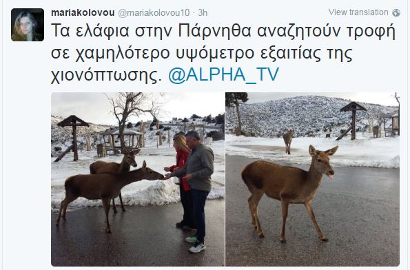 «Τα ελάφια στην Πάρνηθα αναζητούν τροφή σε χαμηλότερο υψόμετρο εξαιτίας της χιονόπτωσης», αναφέρει στο twitter η δημοσιογράφος του Alpha, Μαρία Κολοβού, αναρτώντας δύο φωτογραφίες με τα ελάφια που έχουν κατέβει σε χαμηλότερο υψόμετρο, αναζητώντας τροφή.