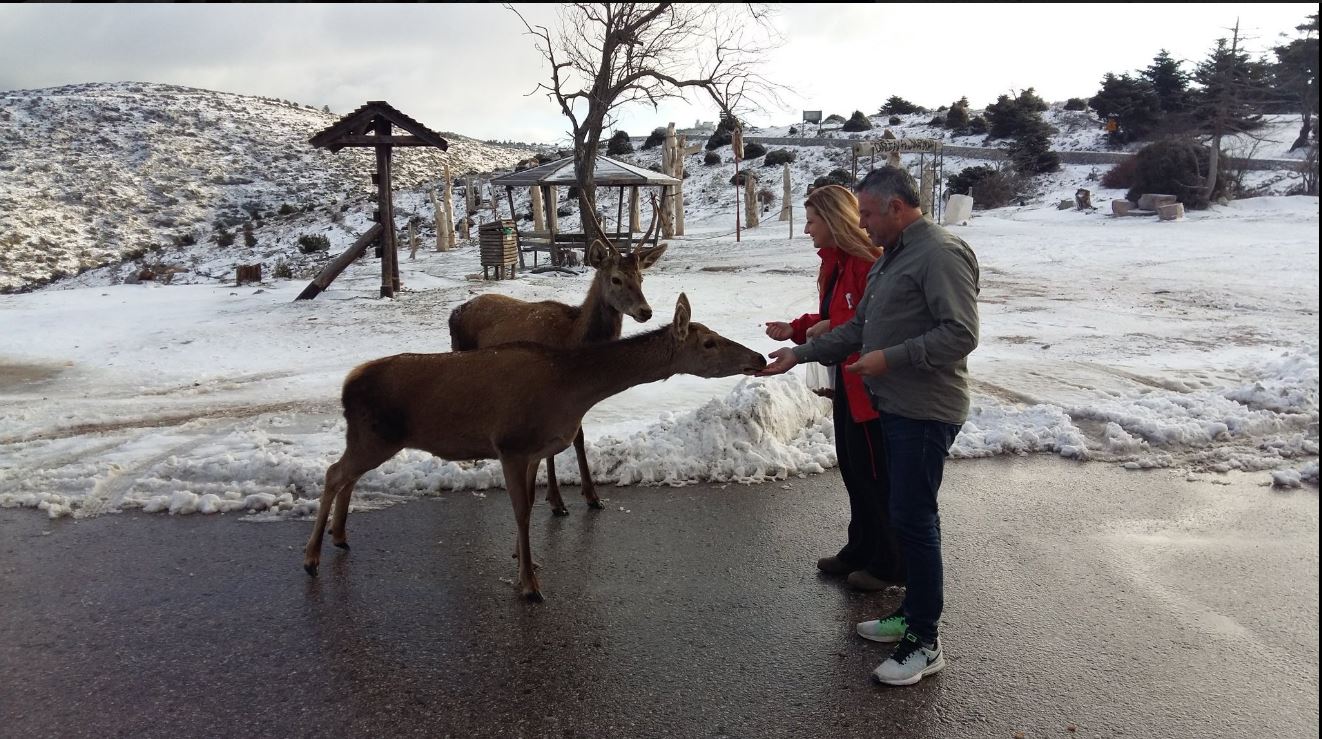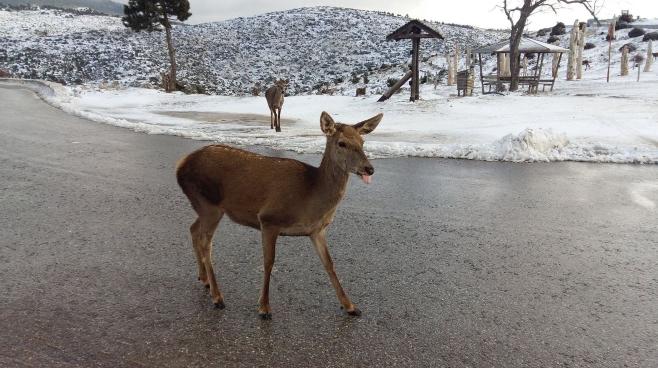 Το χιόνι που έχει πέσει από χθες στην Πάρνηθα ανάγκασε τα ελάφια να κατεβούν σε χαμηλότερο υψόμετρο και να αναζητήσουν φαγητό.