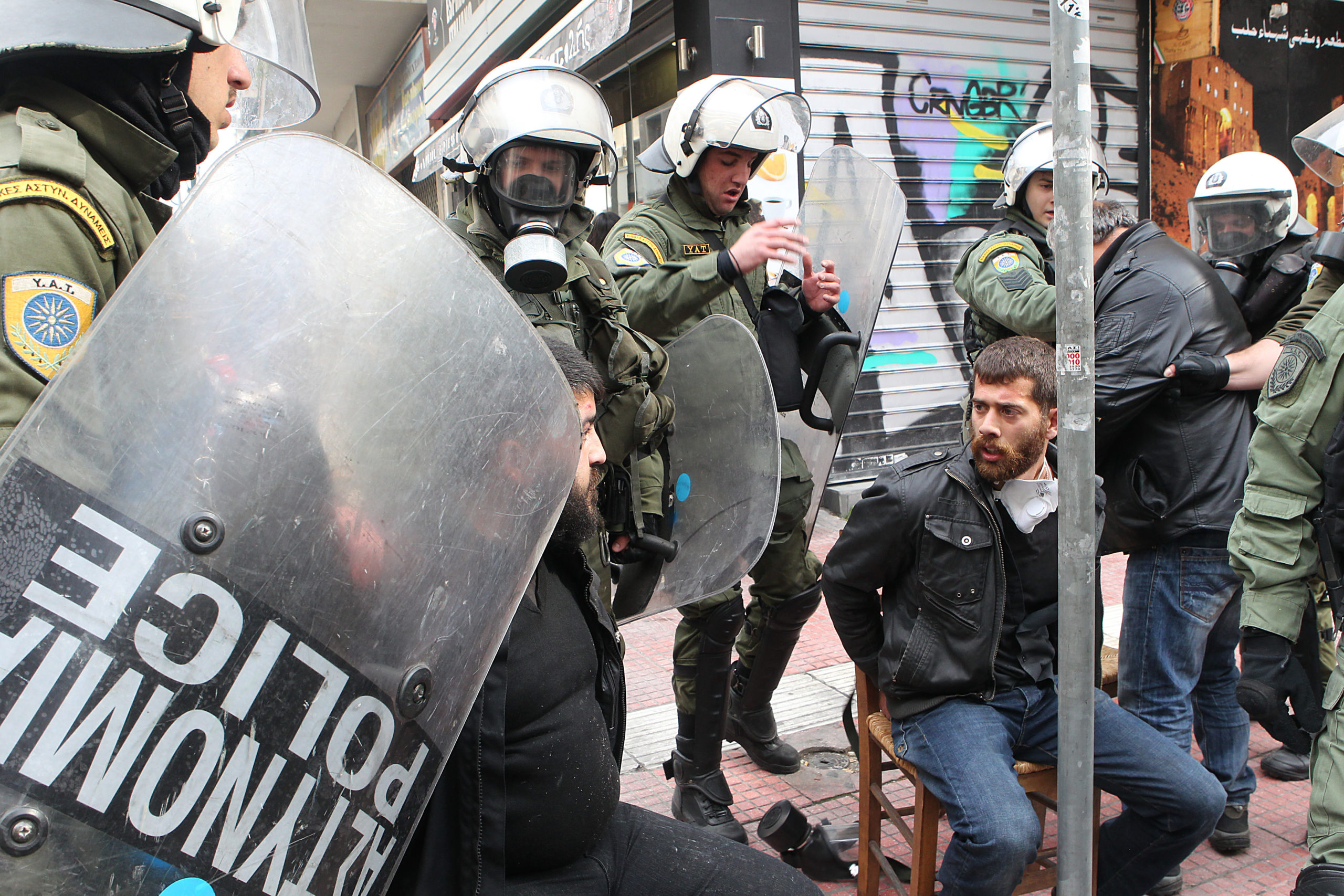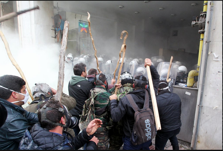 Οι Κρητικοί διαδηλωτές επιτέθηκαν με τις μαγκούρες στα ΜΑΤ, με τους αστυνομικούς να απαντούν με γκλοπ και χημικά.