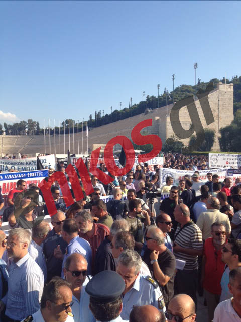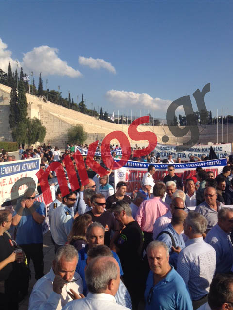Οι ένστολοι που διαδηλώνουν αυτή την ώρα στο Καλλιμάρμαρο, έχουν αναρτήσει πανό με τα συνθήματά τους.Κλιμακώνουν τις κινητοποιήσεις τους, διαμαρτυρόμενοι για τις επικείμενες περικοπές στις αποδοχές τους.