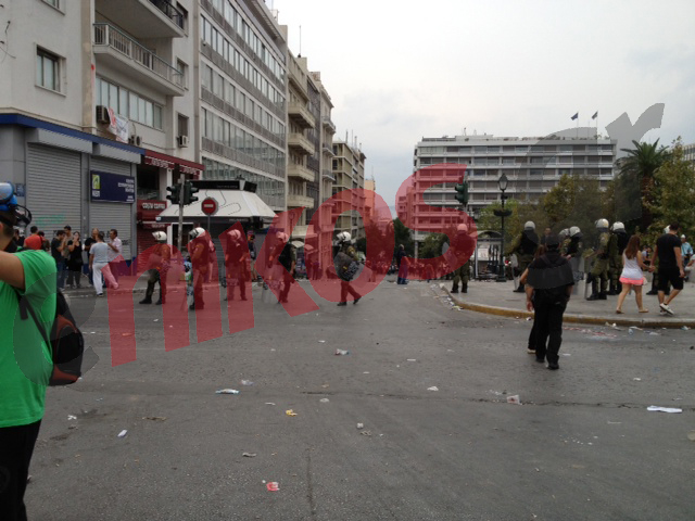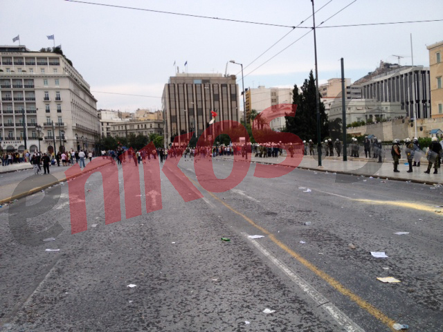 Φορώντας μάσκες, για να αποφύγουν τις παρενέργειες των χημικών, διασχίζουν την Αμαλίας, όσοι διαδηλωτές έχουν παραμείνει ακόμα στο Σύνταγμα.Δείτε τις φωτογραφίες: