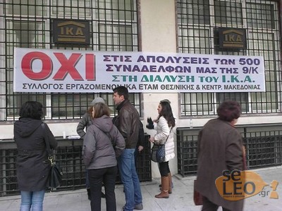 Εργαζόμενοι του ΙΚΑ έχουν συγκεντρωθεί στο Ίδρυμα επί της Αριστοτέλους στη Θεσσαλονίκη, διαμαρτυρόμενοι για την απόλυση 500 συναδέλφων τους.