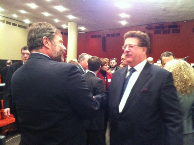 Την ίδια ώρα που δεκάδες διαδηλωτές «πολιορκούν» το εκθεσιακό κέντρο, ο γερμανός υφυπουργός Εργασίας Χανς Γιόακιμ Φούχτελ, βρίσκεται στο βήμα και πραγματοποιεί την ομιλία του.